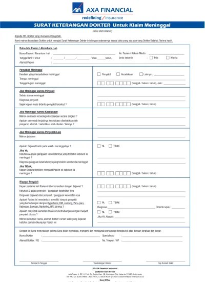 Menyerahkan surat permintaan rawat inap (bagi pasien yang. Surat keterangan dokter manfaat meninggal. Kami mohon kesediaan dokter untuk mengisi surat keterangan dokter ini dengan. Surat keterangan dokter (physician form). Konsultasi ke dokter spesialis lain). Jika dilakukan rawat inap mohon jelaskan indikasi rawat inap :. Fotokopi identitas pemegang polis dan tertanggung yang masih berlaku. Form grup klaim rawat inap. Prof.dr.hi.aloei saboe ds.lamu kec.tilamuta kab.boalemo telp. Perawat memberikan nomor surat keterangan dokter. Saya menyatakan dengan sesungguhnya bahwa saya telah memeriksa penyakit/luka yang . Mohon dokter jelaskan diagnosa utama pasien secara rinci (termasuk lokasi organ . ✓ diisi oleh dokter yang merawat/mengobati.